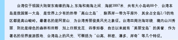 台湾因其地形地貌的特殊性和多样性,同时拥有高山、平原、海岸、河流等自然景观。湖光山色的日月潭,凝重凄美的阿里山云海,阳光明媚的东部海岸,星罗棋布于台湾海峡的澎湖群岛等,诱人风光不胜枚举。同时,宜人的气候使岛内一年四季盛产各种热带、亚热带水果,芭乐、莲雾、木瓜、芒果、葡萄柚等,令您大饱口福,指颊留香。台湾之美就在追风逐鹿间。